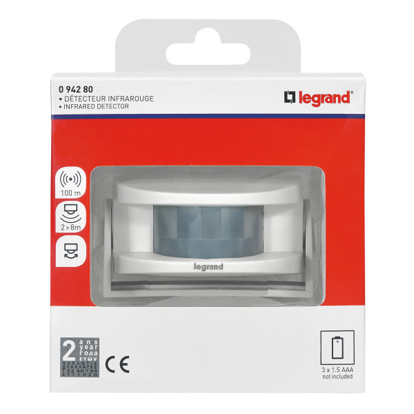 Ce détecteur de mouvement, de la marque Legrand, est un dispositif de commande autonome utilisé dans le système surveillance et de protection résidentielle. Il sert à guider automatiquement un circuit d’alarme ou de sonnerie en fonction de la détection de mobilité corporelle humaine ou d’une présence de corps humain dans son champ de vision. Ce dispositif est spécialement conçu pour piloter les carillons radio de la gamme Confort et Sérénité. Ce détecteur possède un capteur infrarouge apte à détecter un mouvement sur un angle de 110°, avec une portée de 8 m. Il dispose également d’un émetteur radio d’une fréquence de 433,05 à 434,79 MHz pour assurer la transmission des ordres de commande vers le carillon.