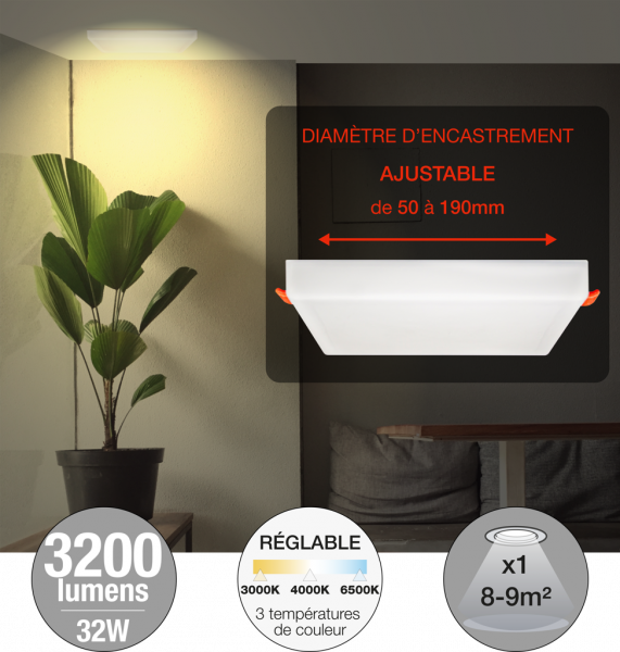 Spot encastré Blanc Carré 220x220 mm LED 32 W 3200 lm ONYX FRAMELESS Arlux – Température de Couleur Réglable à 3 Niveau